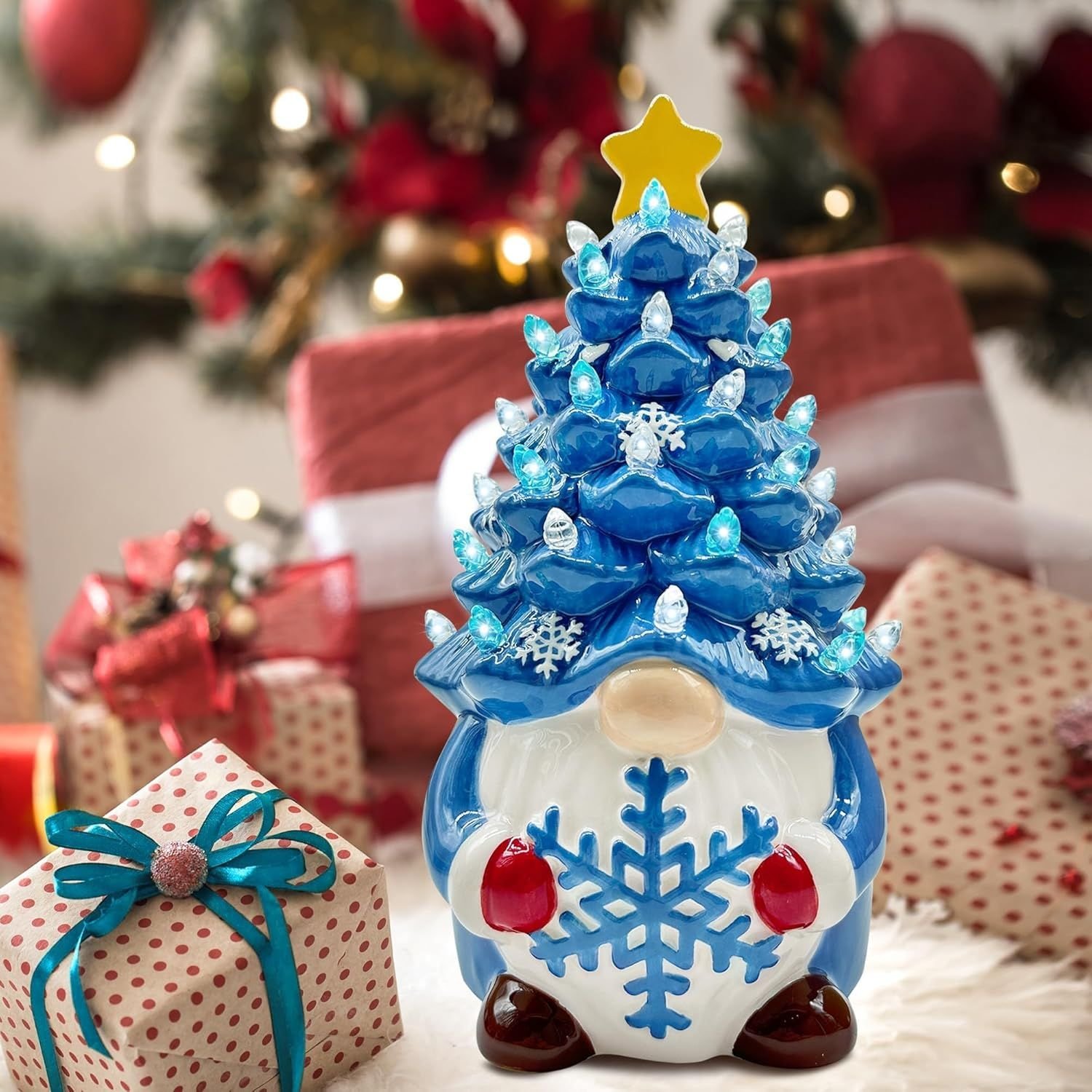 Creative Gnome Christmas Tree Design]Bring festive charm to your home with this unique ceramic lighted Christmas tree, blending beloved gnome motifs with classic holiday decor. Its intricate craftsmanship makes it a standout addition to your Christmas tree decorations.[Premium Ceramic-Resin Durability]Crafted from high-quality ceramic-coated resin, this prelit Christmas tree withstands years of seasonal use. Shatter-resistant construction preserves vibrant colors and delicate details, making it a lasting addition to your holiday decor collection.[Cordless and Convenient]Operate this lighted Christmas tree gnome effortlessly with 2 AAA batteries (not included). The cordless design allows flexible placement on tabletops, mantels, or office desks—no outlets needed. Simply toggle the base switch for instant festive ambiance.[Warm Glowing Holiday Atmosphere]20+ embedded LEDs illuminate the resin branches, casting a cozy glow perfect for Christmas nights. This ceramic lighted Christmas tree creates a magical centerpiece for gatherings or quiet evenings filled with holiday spirit.[Versatile Mini Christmas Decor]Compact 8-inch size adapts to any space: style it on shelves, fireplace hearths, or dining tables. Its lightweight build and timeless gnome-themed design make it ideal for enhancing Christmas tree decorations in homes, offices, or as a portable holiday accent.