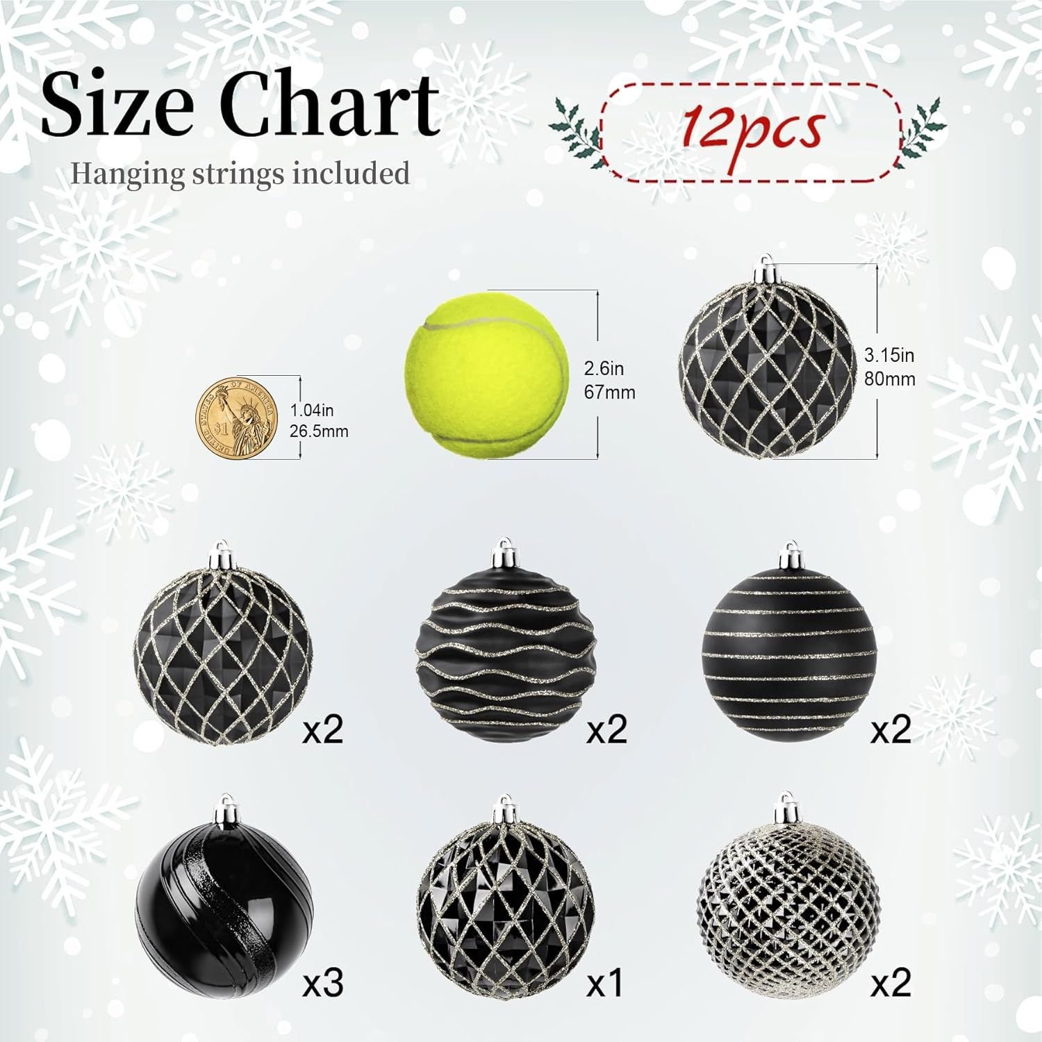 ��[Ideal Size]These christmas baubles are 80mm. Pack of 12 Balls. Perfect fit for any normal size tree.Tree balls with light weight and won't weigh down the Christmas tree branches.��[Shatterproof Material]Made of durable and eco-friendly plastic to provide excellent shatterproof performance and unbreakable practicality while compared with traditional glass products. It is safe around kids, elderly and pets.��[Easy to Hang]Hanging strings have been attached to the balls, and saves a great time and energy for stringing and tying. All you need to take out the Christmas baubles and hang anywhere you like without bothering to search for extra lanyard.��[Unique Design]Christmas Tree balls are done in 3 special finishes: shiny, matte, glitter, which can decorate varied Christmas trees,make your Christmas tree look more beautiful and diversification,create a different christmas spirit.��[Perfect Choice]Perfect fit for decoration in home, hotel, restaurant,Party,Wedding,office buildings, etc Christmas showcase landscape layout, meet the personalized needs of high-end customer.