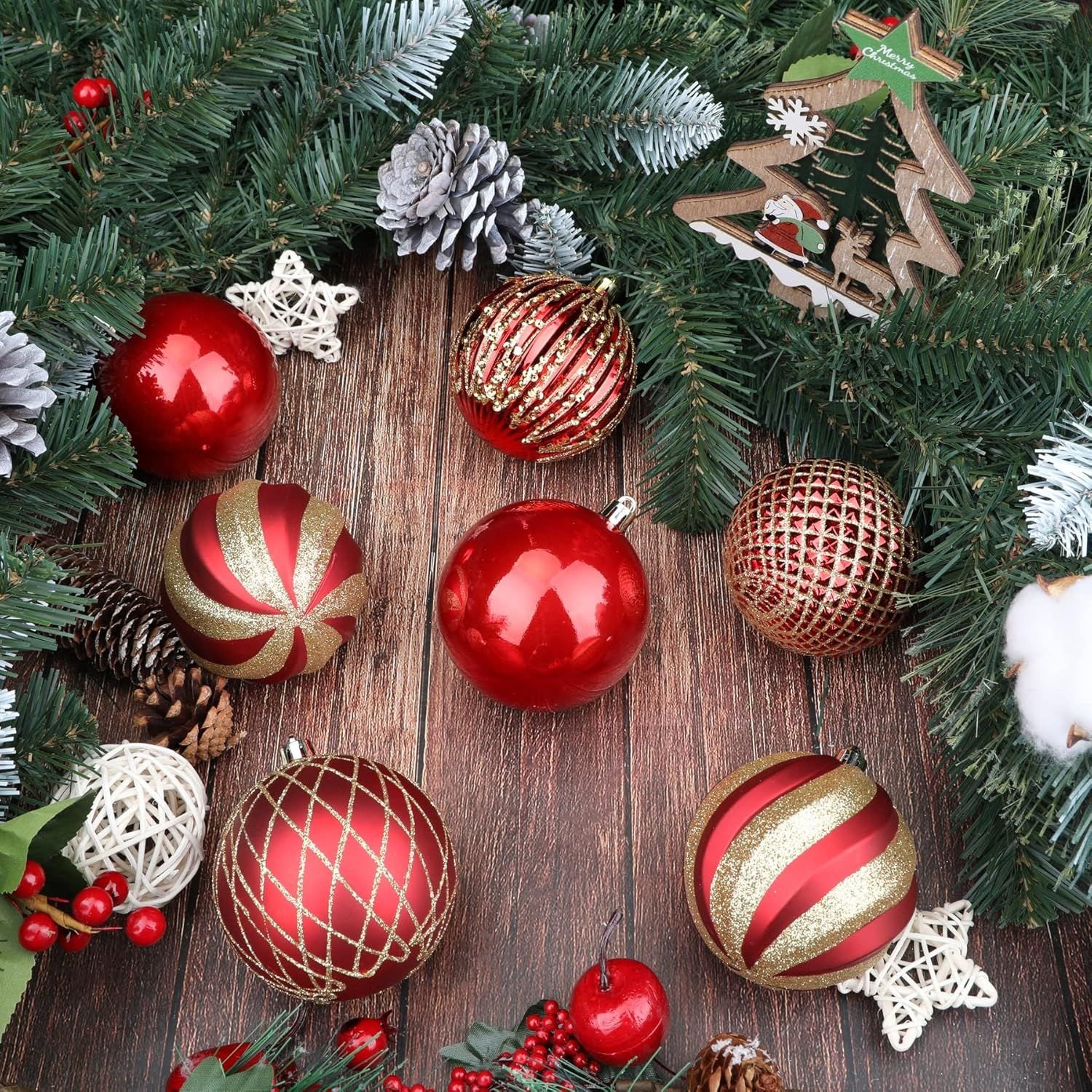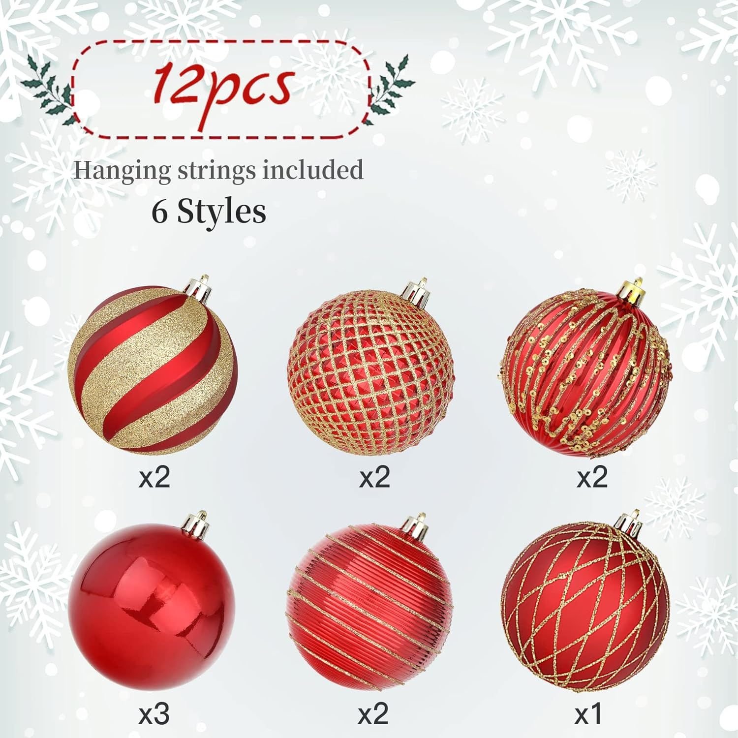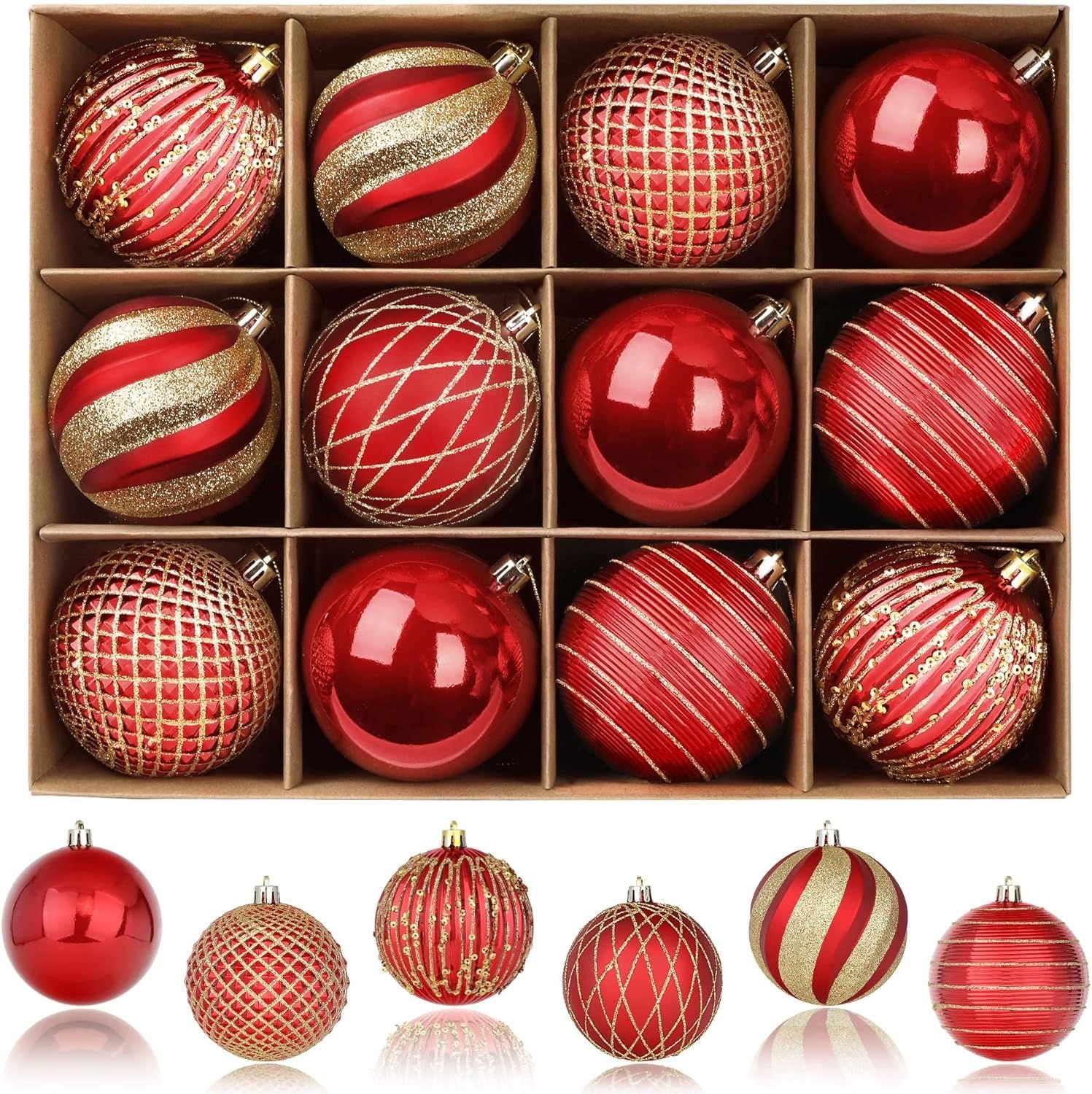 ��[Ideal Size]These christmas baubles are 80mm. Pack of 12 Balls. Perfect fit for any normal size tree.Tree balls with light weight and won't weigh down the Christmas tree branches.��[Shatterproof Material]Made of durable and eco-friendly plastic to provide excellent shatterproof performance and unbreakable practicality while compared with traditional glass products. It is safe around kids, elderly and pets.��[Easy to Hang]Hanging strings have been attached to the balls, and saves a great time and energy for stringing and tying. All you need to take out the Christmas baubles and hang anywhere you like without bothering to search for extra lanyard.��[Unique Design]Christmas Tree balls are done in 3 special finishes: shiny, matte, glitter, which can decorate varied Christmas trees,make your Christmas tree look more beautiful and diversification,create a different christmas spirit.��[Perfect Choice]Perfect fit for decoration in home, hotel, restaurant,Party,Wedding,office buildings, etc Christmas showcase landscape layout, meet the personalized needs of high-end customer.