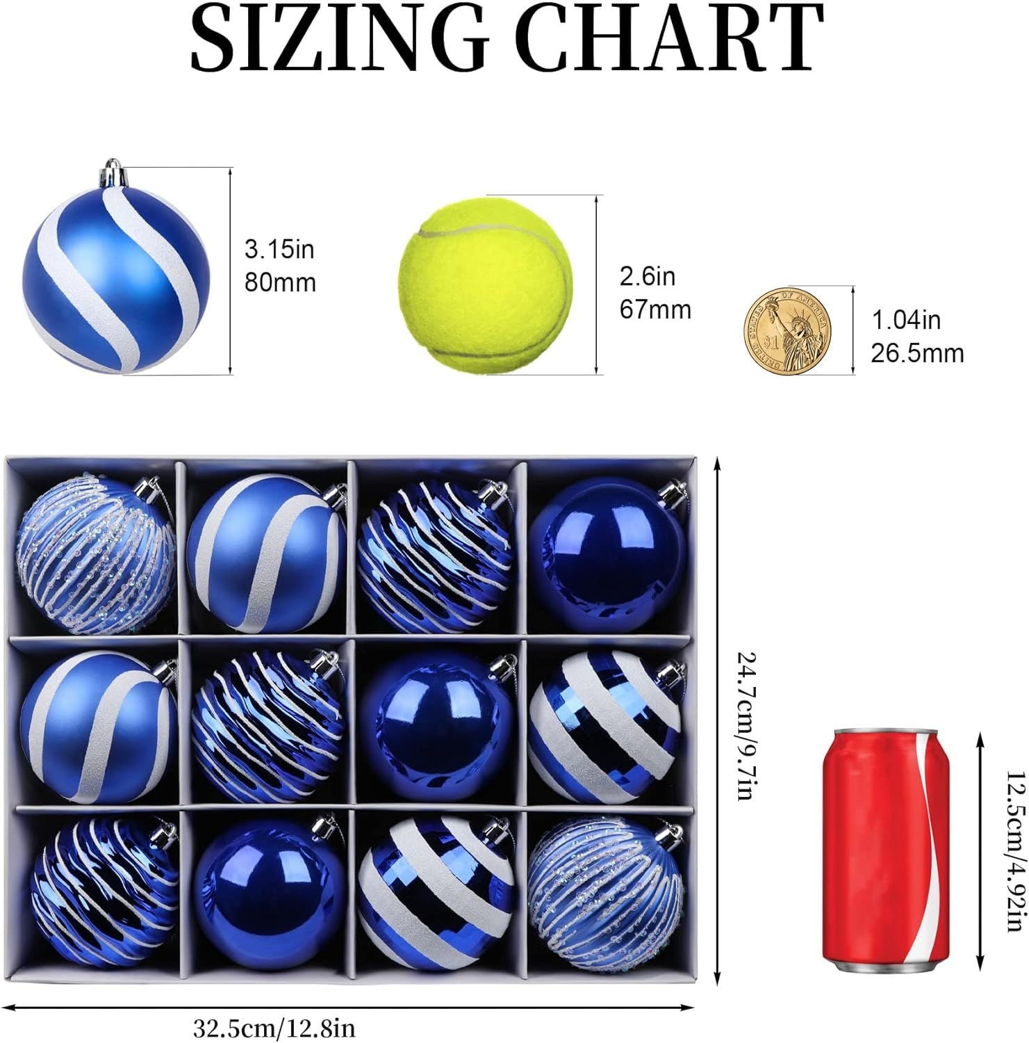 ��[Ideal Size]These christmas baubles are 80mm. Pack of 12 Balls. Perfect fit for any normal size tree.Tree balls with light weight and won't weigh down the Christmas tree branches.��[Shatterproof Material]Made of durable and eco-friendly plastic to provide excellent shatterproof performance and unbreakable practicality while compared with traditional glass products. It is safe around kids, elderly and pets.��[Easy to Hang]Hanging strings have been attached to the balls, and saves a great time and energy for stringing and tying. All you need to take out the Christmas baubles and hang anywhere you like without bothering to search for extra lanyard.��[Unique Design]Christmas Tree balls are done in 3 special finishes: shiny, matte, glitter, which can decorate varied Christmas trees,make your Christmas tree look more beautiful and diversification,create a different christmas spirit.��[Perfect Choice]Perfect fit for decoration in home, hotel, restaurant,Party,Wedding,office buildings, etc Christmas showcase landscape layout, meet the personalized needs of high-end customer.