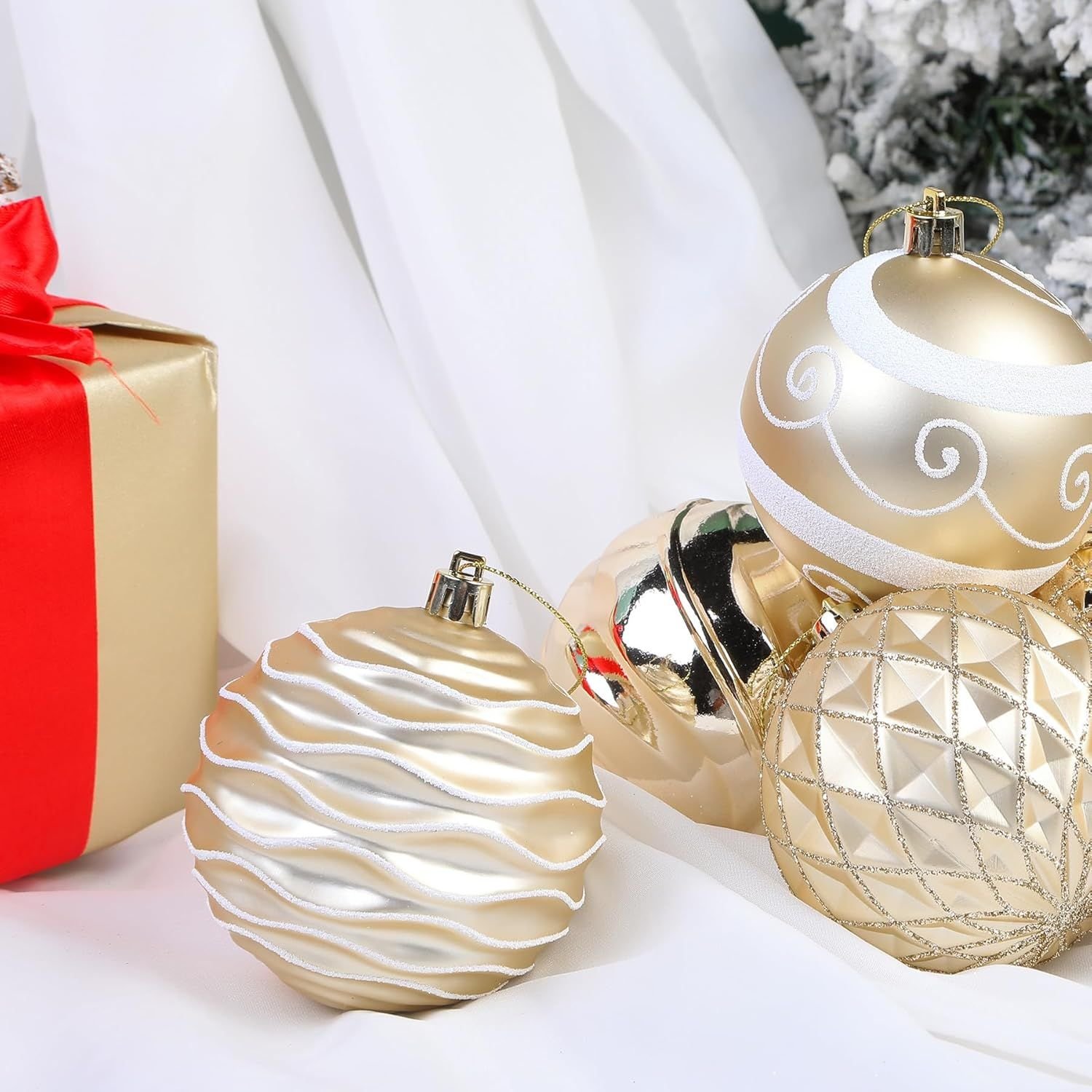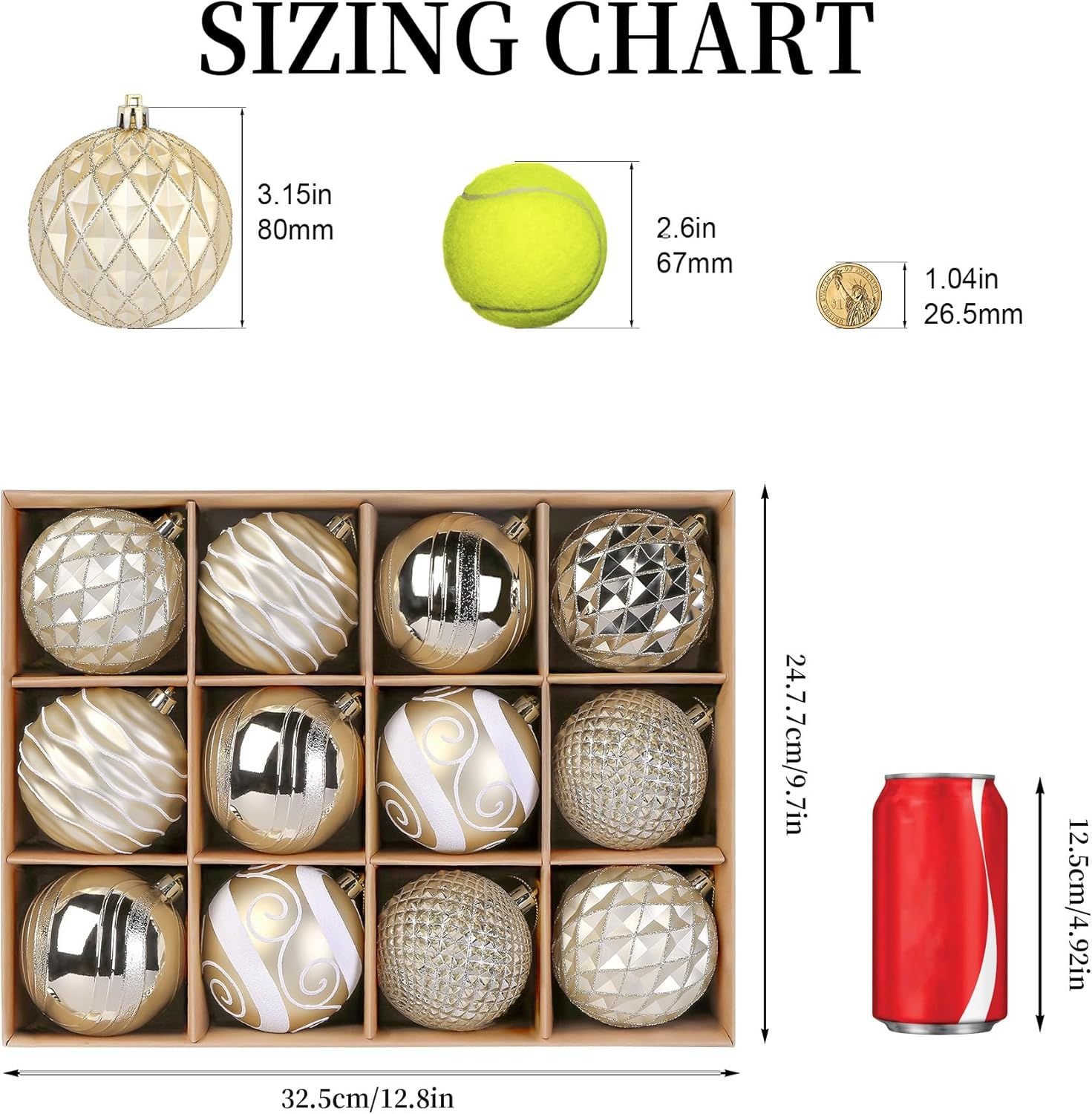 ��[Ideal Size]These christmas baubles are 80mm. Pack of 12 Balls. Perfect fit for any normal size tree.Tree balls with light weight and won't weigh down the Christmas tree branches.��[Shatterproof Material]Made of durable and eco-friendly plastic to provide excellent shatterproof performance and unbreakable practicality while compared with traditional glass products. It is safe around kids, elderly and pets.��[Easy to Hang]Hanging strings have been attached to the balls, and saves a great time and energy for stringing and tying. All you need to take out the Christmas baubles and hang anywhere you like without bothering to search for extra lanyard.��[Unique Design]Christmas Tree balls are done in 3 special finishes: shiny, matte, glitter, which can decorate varied Christmas trees,make your Christmas tree look more beautiful and diversification,create a different christmas spirit.��[Perfect Choice]Perfect fit for decoration in home, hotel, restaurant,Party,Wedding,office buildings, etc Christmas showcase landscape layout, meet the personalized needs of high-end customer.