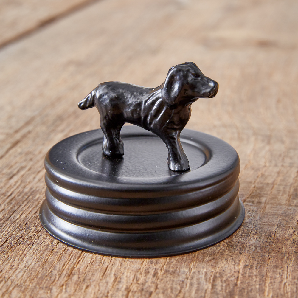 We can't help but spoil our pups with lots of treats! Store them for freshness inside our farmhouse staple mason jar. The jar is created of glass and features embossed lettering with the phrase ''Dog Treats'' on the front. The metal lid features a Labrador Retriever on top.